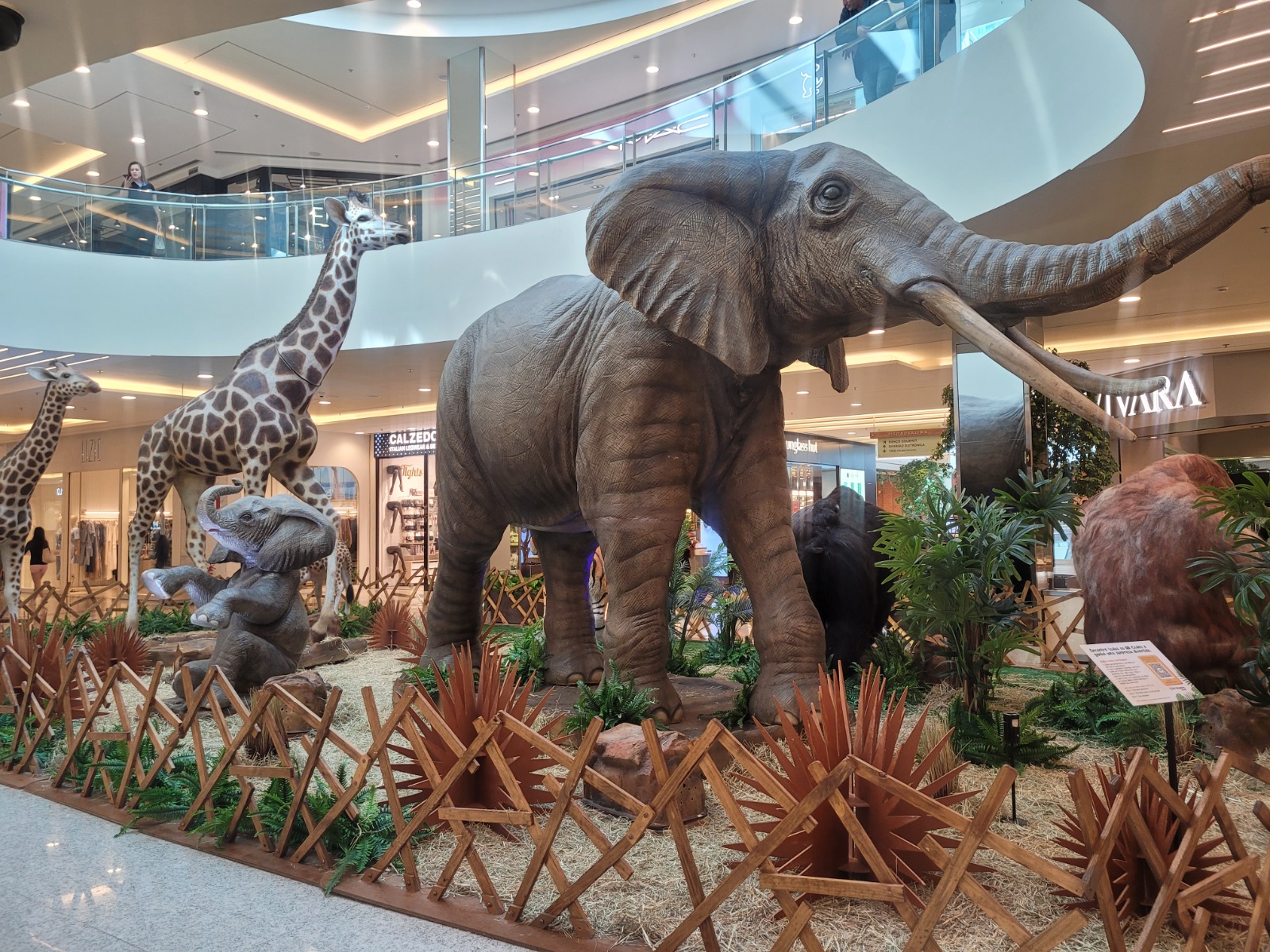 Instalada nos corredores do shopping, a mostra tem acesso gratuito e reúne figuras como girafas, elefantes, leões, zebras, pandas e uma cobra gigante.