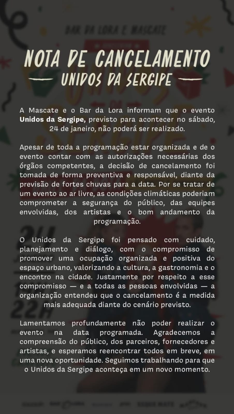 “A Mascate e o Bar da Lora informam que o evento Unidos da Sergipe, previsto para acontecer no sábado, 24 de janeiro, não poderá ser realizado.
