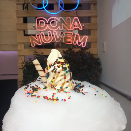 A sorveteria oferece sorvetes temáticos acompanhados de algodão-doce. O cardápio inclui outras opções, como milk-shakes e biscoitos personalizados.
