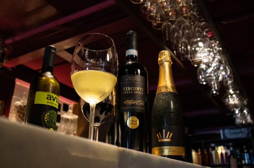 Trio de rótulos e taça de vinho branco no balcão do Cabernet Butiquim, que celebra 10 anos com evento especial em Belo Horizonte