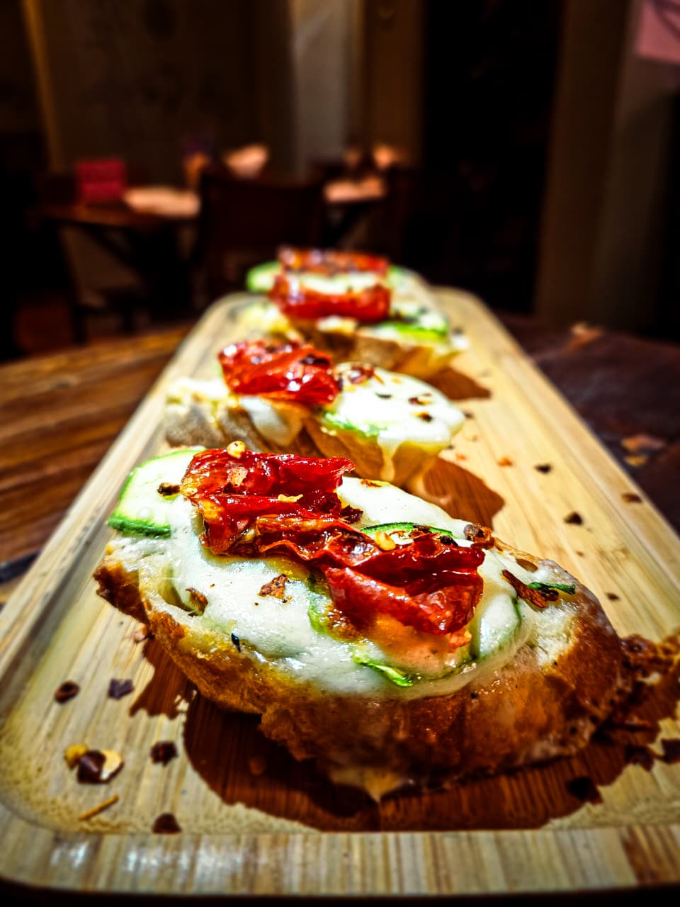 Entre os pedidos, a bruschetta de abobrinha também se destaca: leve e bem equilibrada, combina tomate confitado, muçarela e um toque sutil de pimenta, funcionando como uma boa porta de entrada para a refeição.
